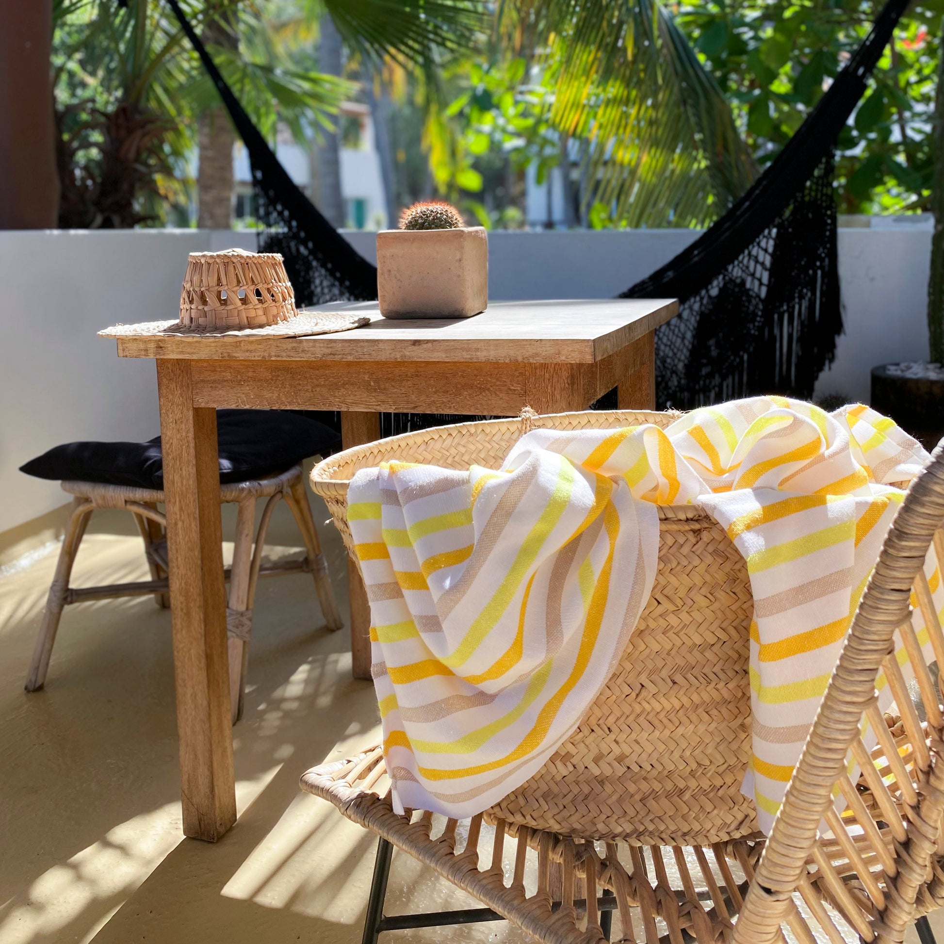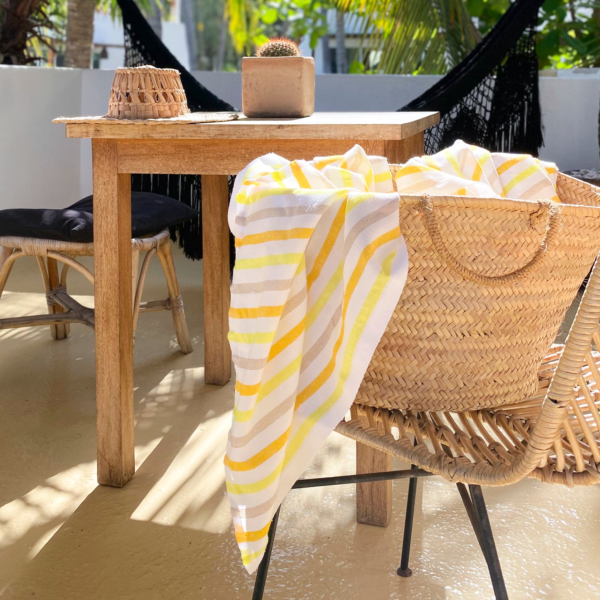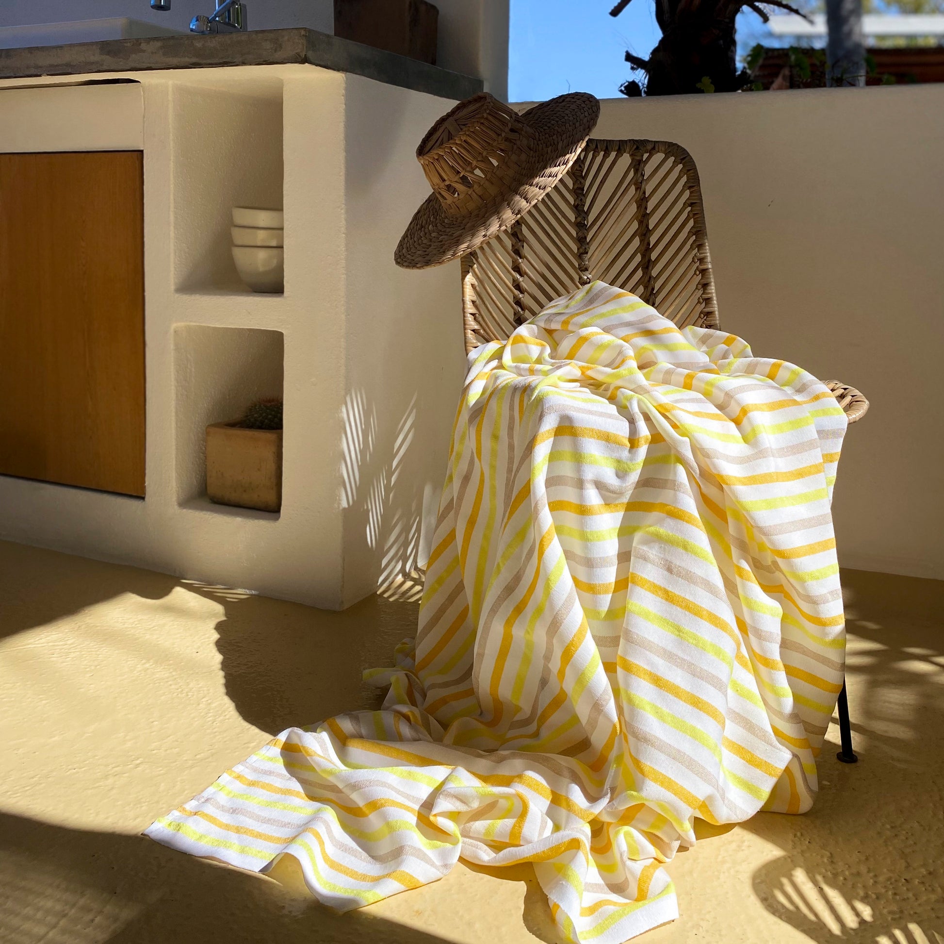 Esta ligera y adorable manta de playa es tejida en México, usando algodón reciclado e inspirada por las telas tradicionales del país.