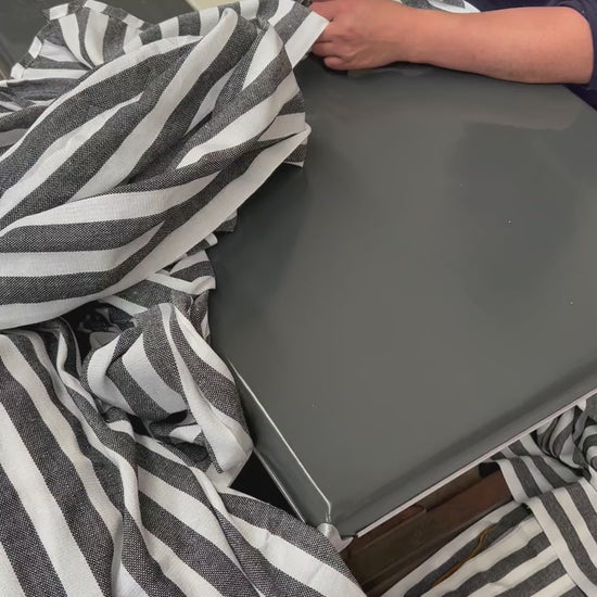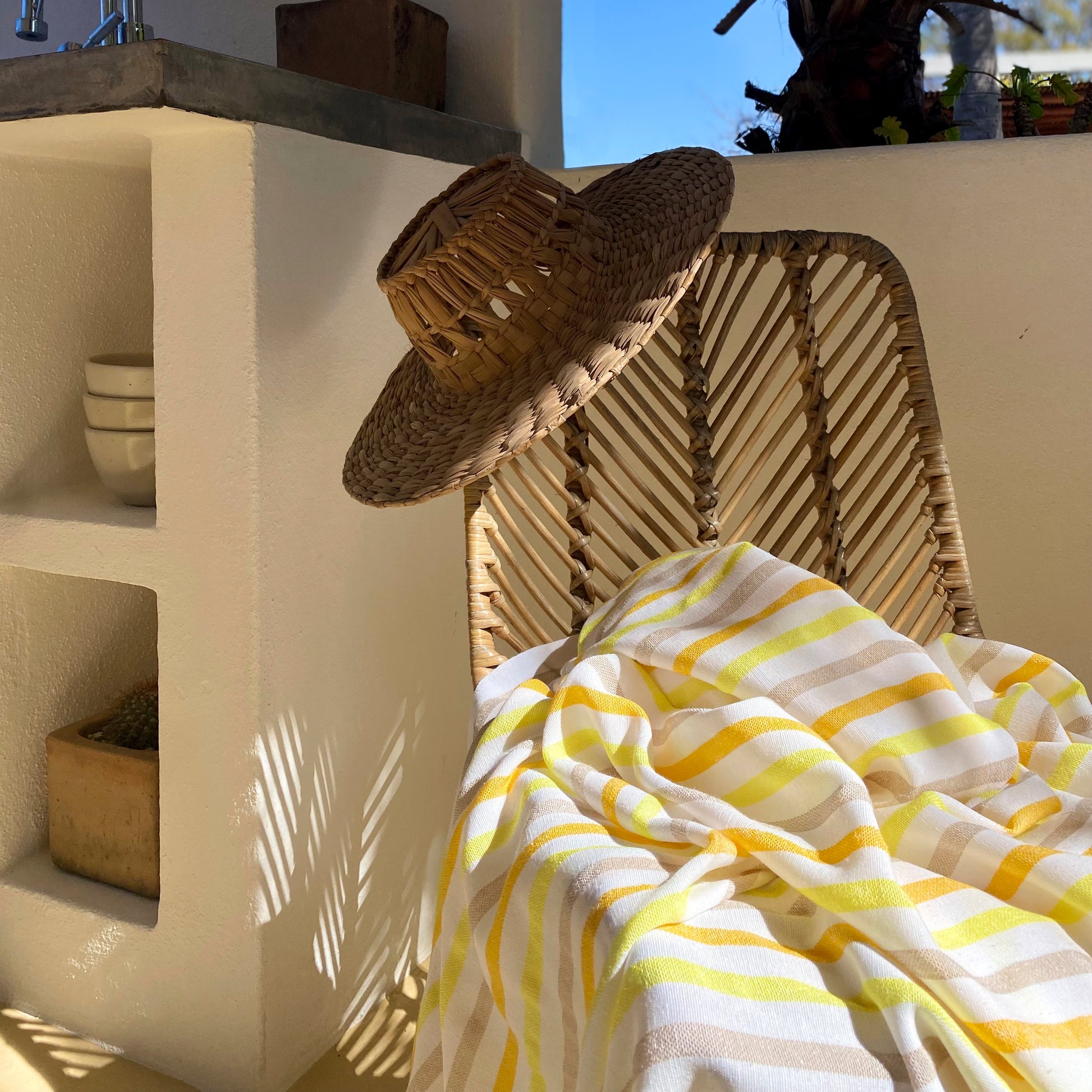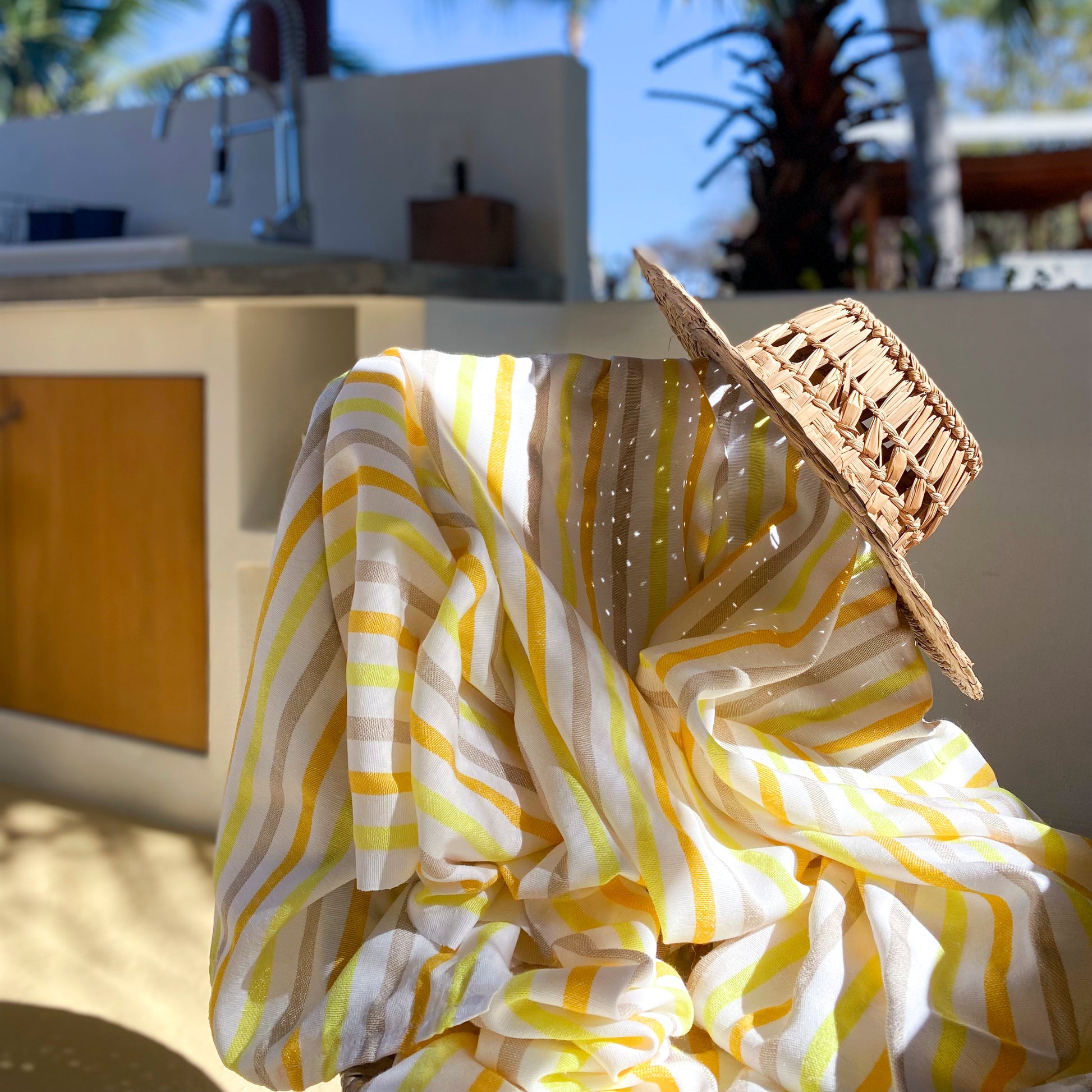 Esta ligera y adorable manta de playa es tejida en México, usando algodón reciclado e inspirada por las telas tradicionales del país.