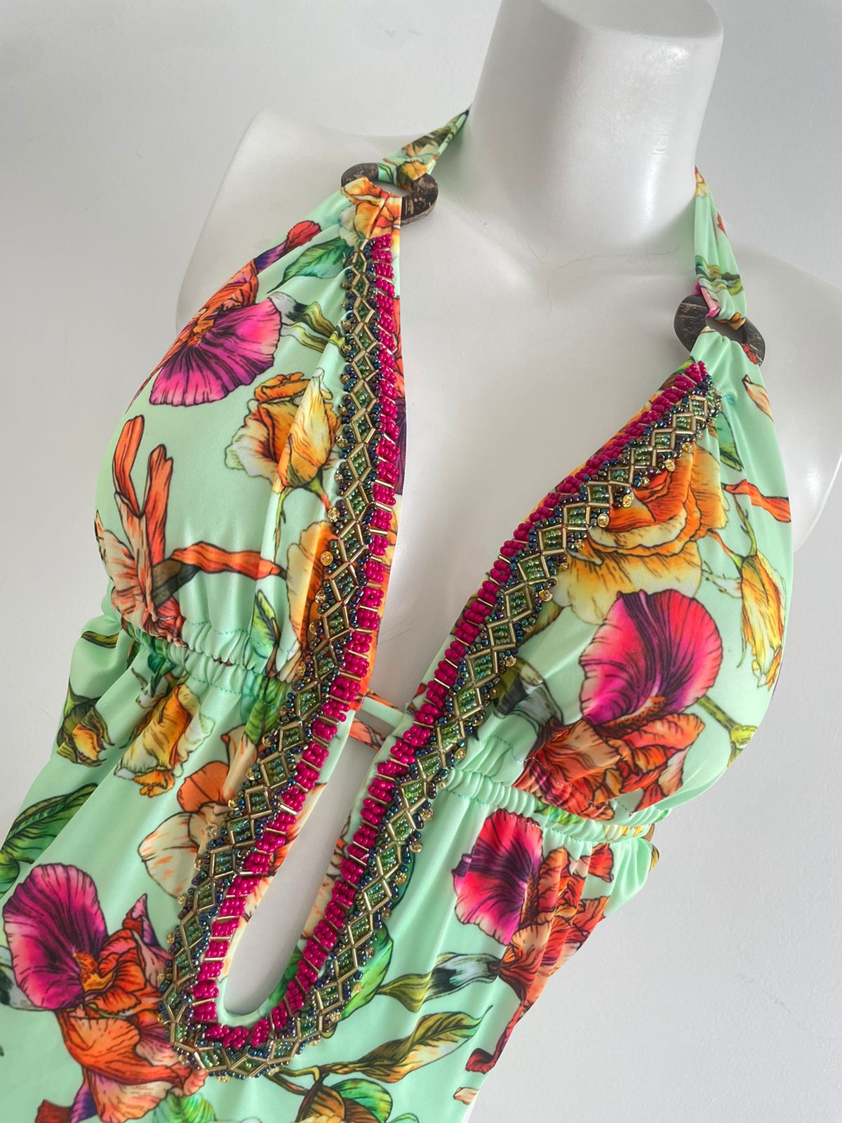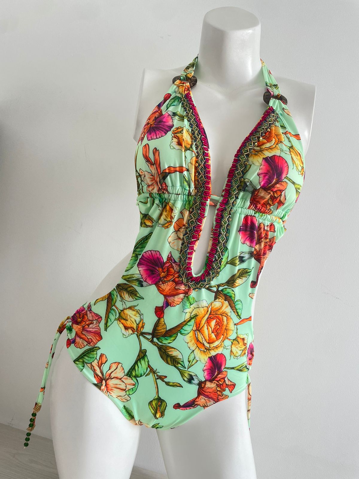 Este increíble trikini cómodo tiene copas push up removibles, panty calzón clásico ajustable de los listones con un increíbles bordado artesanal y pedrería a mano.